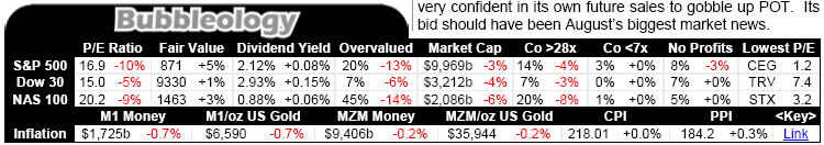 Stock-Market Valuations Most of the Bubbleology table is dedicated to stock-market valuations. We track these key valuation metrics each month for the three most important stock indexes in the US and quite probably the entire world. The S&P 500, of course, are the 500 biggest and best companies in the US and the most-widely-accepted proxy for the markets as a whole. The Dow 30 are the 30 elite blue-chip giant American companies of the Dow Jones Industrial Average. They are so large they utterly dominate the US stock markets. And finally the tech-heavy NASDAQ 100 index, the 100 biggest and best NASDAQ companies, is analyzed.