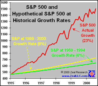 The first place to search in order to evaluate the recent incredible S&P 500 mega rally of the last six years is recent S&P history. One way to detect an anomaly (or determine if everything is sound) is to analyze and compare performance before the period in question (1995 to today). In January 1959, the S&P 500 closed under 56. In August 2000, the index closed above 1500. If this return is averaged over the whole 42 year period, it approximates a compound annual return of 8.23%. An 8%+ return per year is quite impressive over four decades, and slightly above the long-term equity average. From 1995 to 2000, the index managed a staggering 22.98% compound annual return, jumping from 465 to 1500 over this short period. The S&P 500 roughly tripled its historical average return from 1995 to 2000. One has to wonder to what the extraordinary recent performance of the S&P may be attributed. Just as a control on this exercise, it is also beneficial to analyze complete S&P 500 returns from January 1959 to December 1994, in order to establish a kind of historical base period to which the last six years may be compared. In December 1994, the index hovered around 455, yielding a compound annual growth rate over this 35 year period of only 6.01%. From the perspective of this baseline, the S&P 500 actually nearly QUADRUPLED its 35 year historical average return in recent years!