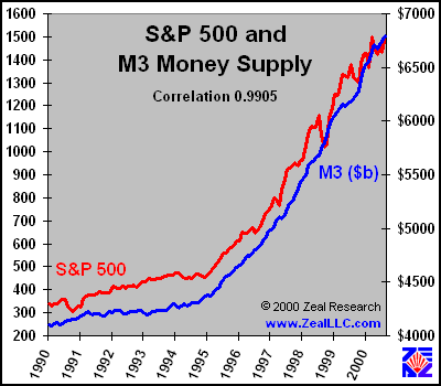 With the ever-helpful perspective gained from standing on the giant shoulders of history, the probability that the recent returns are unlikely to be replicated into the future is vast. If the awesome growth in the S&P 500 did not occur due to the wonderful “New Era” of unlimited productivity and super-technology as bubblevision claims each day, what may be responsible for its performance? The consensus answer to that important question among thinking contrarian analysts is, without a doubt, two ominous words … CREDIT BUBBLE. Throughout history, the classic cause of speculative manias is an increase in the underlying money supply that feeds the voracious appetites of the capital markets. As more money is created, more capital is available to chase speculative investments and prices can rocket to obscene heights. In Holland in the 1630s, for instance, simple garden tulip bulbs were traded on organized exchanges and some reached prices worth more than a fleet of tall ships and the professional sailors to crew them! With the universal acceptance of inherently worthless fiat currency backed by absolutely nothing but the good faith of the government that issued it, money supplies around the world have grown dramatically since 1995. The United States Federal Reserve is the chief hooligan in unrestrained fiat currency growth as the broad M3 measure of US money supply has rocketed from $4.4t to $6.8t since early 1995. The graph below shows the S&P500 since 1990 graphed against M3…