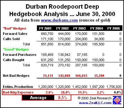Everything considered, pretty darn well! The average net “bad” hedge exposure for Durban grew from 8.5% over five years to 8.8% over five years, or around a 2.25% increase in the absolute net bad ounces hedged. Some hedges appear to be shifted from FY2002 to FY2001 relative to the previous quarter, reducing the net bad hedge exposure next fiscal year (begins July 2001) and increasing the net bad hedge exposure in this current fiscal year. In light of the worst whole quarter of real gold prices in US dollar terms since the early 1970s, this small increase in the average net bad hedge exposure is actually quite an accomplishment. Hedge shedding is best accomplished under favorable gold market price movements, which last quarter certainly lacked. On an absolute basis, the slight increase in net bad hedges occurred due to good hedges being closed out. Absolute bad hedges shrunk in the quarter.