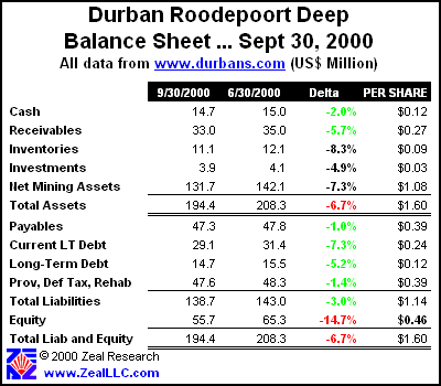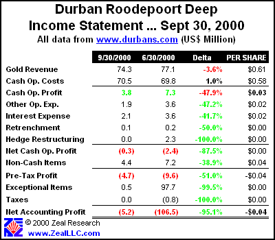 We will begin with a gander at Durban’s newest quarterly income statement. The income statement provides a running summary of all the business activity of the quarter. The latest quarter ended September 30 is the first column in the table below, while the June 30 quarter is presented next. Both of these columns are in millions of US dollars. The third column shows the percentage change between the two quarters. The final column shows the September 2000 quarterly results per common share, in US dollars per share…