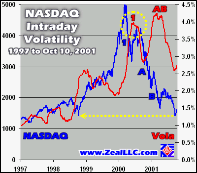 First, because we use a lagging 100-day moving average to smooth raw intraday volatility, the actual volatility top lags the volatile selling event that caused it. In our studies of historical double volatility tops, the ultimate second volatility top occurs AFTER the ultimate bear market bottom. With the NASDAQ plunging towards its April lows even before the terrorist attacks, it is readily apparent that the “V” shaped rally off the April lows did not mark the ultimate NASDAQ bottom, as we have articulated in numerous essays including “Equity Bulls in Denial” published on May 11, 2001 when the NASDAQ closed at 2107.