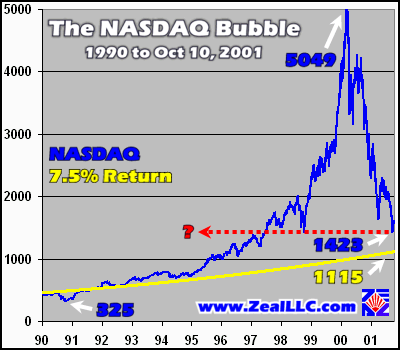 The goal of this essay is to once again throw our opinions into the fray on the elusive NASDAQ bottom. For many reasons we believe that the post-attack NASDAQ closing low of 1423 on September 21 is NOT the ultimate bear market bottom for the NASDAQ. Since this essay would evolve into a small book if we articulated all the reasons why we think we have not yet witnessed the ultimate NASDAQ bottom, we are limiting the scope to three primary discussions.