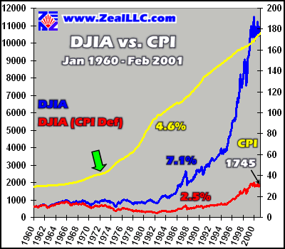 When the DJIA is deflated by the CPI, the real return of the index averaged only 2.5% compounded annually in four decades! The CPI deflated DJIA closed at 1745 at the end of February 2001. Even though these numbers were computed with monthly data and compounded monthly since 1960, they can also be derived through simple math. With the nominal DJIA scoring a 7.1% return, and inflation measuring 4.6%, the real rate of return on the DJIA over this time period is 7.1% less 4.6%, or 2.5%. NOT very impressive!