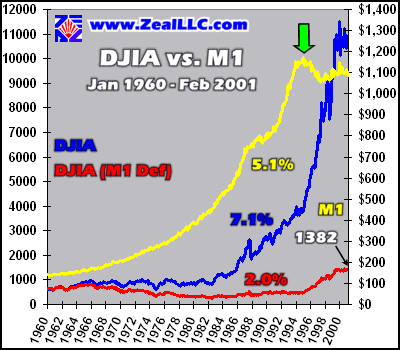 In terms of M1, the Dow managed a DISMAL 2.0% real return over the last forty one years. The M1 deflated DJIA closed at 1382 in the final trading day of February 2001. With a 2% real return, it takes 36 YEARS to double one’s capital in constant purchasing power terms. Ouch! Inflation is dead? Equities are the best place for inflation? No way. If the greatest bull market in US history STILL only managed to exceed narrow money supply growth slightly and yield a paltry 2% real return, we shudder to think how poorly equities would do in real terms in normal periods of equity market history.