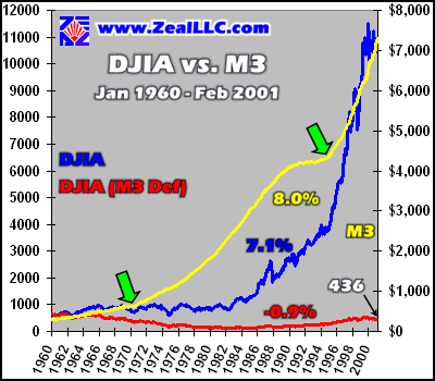 If the first two graphs of real DJIA returns were ugly, this one is positively terrifying. In real terms as deflated by M3 growth rates, the DJIA yielded a NEGATIVE 0.9% real rate of return over four decades! The Fed recklessly grew the M3 money supply SO fast, at 8% compounded annually, that the poor DJIA couldn’t even keep up. In M3 terms, the DJIA slow-motion slumped from 622 in 1960 to 436 in February 2001. The long touted bullish myth that US equities stand up well to inflation, as properly defined by money supply growth, is shattered.