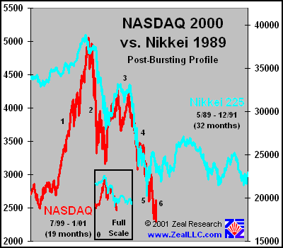 The parallels between the recent NASDAQ action and historical Nikkei 225 events are uncanny and a little unsettling. Marked by the “1”, the terminal blow-off of the NASDAQ was vastly steeper and more ballistic than the Nikkei. This is a DIRECT result of Greenspan and the boys flooding the markets with vast quantities of credit in the run-up to Y2k. Funny how some refuse to call the NASDAQ a bubble but NO ONE disputes that the Japanese equity markets were bubble-licious slightly more than a decade ago. In region “2”, the initial burst was much more damaging to the NASDAQ than to the Nikkei. The NASDAQ bubble is more extreme by all empirical measurements.