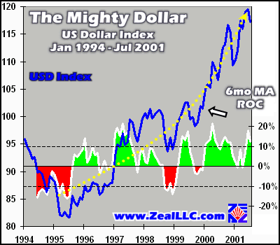 As in much financial analysis, a prudent embarkation point is found in perusing a graph of recent US dollar price action. We constructed a graph of monthly US Dollar Index closes from 1994 to July 2001. The dollar index is graphed below as the blue line and slaved to the left axis. The right axis marks the six-month moving average of the annualized monthly rate of change in the dollar index. For instance, if the dollar index had an absolute change in value of 1% over a single month, that rate of change is annualized to 12% to equate to normal annual growth rates. These annualized growth rates are then distilled down into a six-month moving average that is shown in the graph below as the white line. Green shaded areas mark periods of time where that moving average dollar index appreciation rate was positive, and red where it was negative.