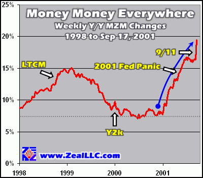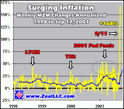 If you had told me one month ago before the attacks that Greenspan, even though he is a world-champion inflationist, would have the sheer audacity to balloon the narrow MZM money supply at an almost 175% annualized rate, I would not have believed it. Yet, after the attacks, the Fed decided it was prudent to throw the hard lessons of financial history to the winds and literally deluge the US financial system with freshly created fiat money. It was an extraordinary monetary event, the financial equivalent of an undersea earthquake that will eventually have an enormous impact as it slams into the fragile shores of the world financial markets.