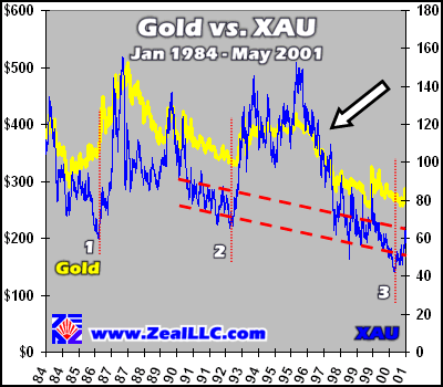 That brings us to the final “3” XAU bottom, which occurred in 2000. This latest rally is really interesting as the XAU began to rally well before gold had its latest rally culminating in the anomalous May 18, 2001 post-London close trading spike. We discussed that extensively in our earlier essay “Gold Prepares to Erupt”. Unfortunately, however, even though the XAU has led gold in 2001 it has not shattered the top of its descending trend channel established through much of the 1990s. Also, alas, gold has yet to exhibit any substantial follow-through to the May 18 spike, so we remain in a state of limbo regarding the ultimate outcome of this recent exciting XAU rally we have witnessed.