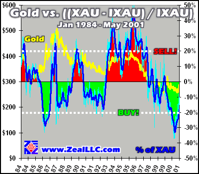 A couple weeks ago I received an e-mail from an esteemed member of the Gold-Eagle Gold Forum (www.gold-eagle.com). The gentleman, known by his cyber-handle of PMTrader, suggested that it would be an interesting research undertaking to do an analysis of the spread between gold and the XAU. By taking the gold price (say $300), and subtracting the XAU level (say 60), the gold XAU spread is obtained (240 in this example).