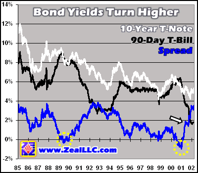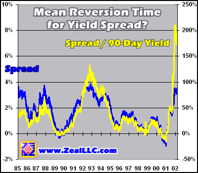 As my whole investing life has been in the era of the venerable King of Bonds, the 30-year Treasury Bond, I still feel uncomfortable defining something as a yield curve when the Long Bond is missing. Just because some Rubin-era US Treasury sycophant tried to brazenly manipulate long-term interest rates after the 9/11 market dislocations last October by announcing the death of the Long Bond does not mean that it will not be resurrected. Actually, as the legions of Keynesian socialists in the bloated American government continue to aggressively spend money they don’t have, I fully expect the 30-year T-bond to be officially reintroduced in the not-too-distant future as government financing “needs” explode. For now, however, we will grudgingly use 10-year T-note yields as the long end of the curve for our spread calculations.
