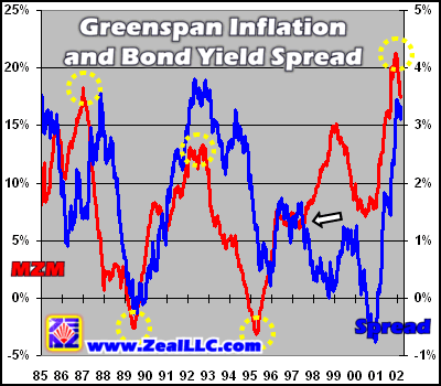 Not surprisingly, as the US MZM money supply inflates dramatically with mega-inflationist Alan Greenspan at the helm, the bond yield spread widens. The peaks and troughs above in the blue yield spread and the red year-over-year MZM growth rate match quite well. Bond investors demand higher premiums for lending their capital over time when monetary growth is high because they know it is the true textbook definition of inflation.