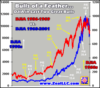 It is very interesting that in both historical Dow periods the first half of the graph, roughly the first 17 years, witnessed generally sideways trading action. As time relentlessly marched forward valuations gradually descended as corporate earnings caught up with stock prices, but for the most part there were no spectacular moves in the Dow 30.