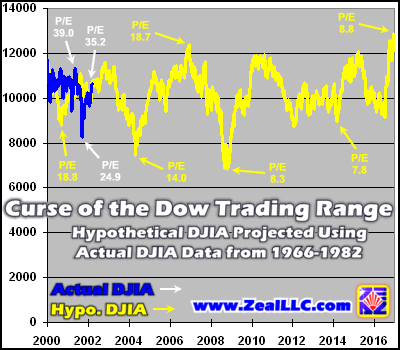 Worst case, the Dow 30 could easily buck the trading range and head down much faster. Based on the far higher peak P/E reached in this most recent DJIA speculative mania as compared to the mighty bull of the 1960s, we believe that there is a high probability that we could actually see the Dow 30 plunge to the 4000 range at some point in the next few years. In many ways, a quicker washout bottom for the Dow 30 could be less psychologically damaging to investor confidence than a 17-year trading range! Following a washout bottom, a new bull market could commence much sooner than if we all have to suffer through a brutal 17-year sideways moving Dow 30.