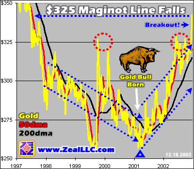 Last year less than a month after the new gold bull was born we published an essay called “Gold Prepares to Erupt” on May 25th, 2001. In this essay I wrote, “With these recent historical technical precedents, we believe $325 gold is the current mega-critical level, the nexus of the struggle to liberate gold from its oppressors.”