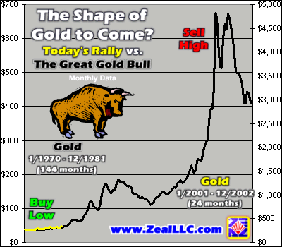 This crucial caveat aside, as exciting as our wonderful new gold bull is to date it is barely in its earliest stages in historical context. The way gold today (right axis, yellow) is tracking the progression of the last Great Gold Bull (left axis, black) is absolutely uncanny. If today’s new gold bull even approaches the magnitude of its most recent noble ancestor, the big party is just barely beginning for gold and gold-stock investors!
