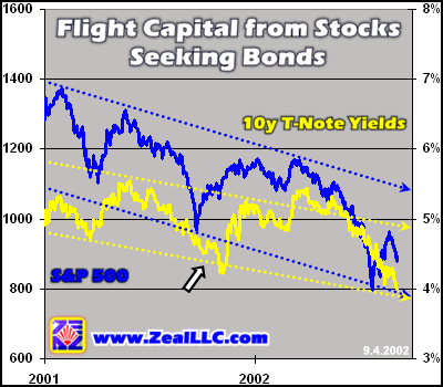 Between the aforementioned S&P 500 supercycle top on March 24th, 2000 and September 4th, 2002, the data cutoff for this essay, the S&P 500 fell by 41.5% and 10y Treasury yields plunged by a comparable 36.0%, from 6.2% to 3.97%, today’s nearly four-decade low. The almost perfect strategic symmetry in the overall magnitude of the drops in both stocks and bond yields is stunning.