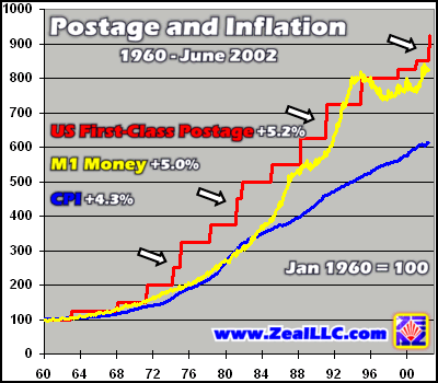 The postage growth rate more closely approximates the narrow M1 money supply than the CPI. When relatively more money chases after relatively fewer goods and services, inflation is the result. As the money supplies in the US, courtesy of the extra-Constitutional private Federal Reserve central bank, have been growing much faster than the US economy since Nixon’s gold default in 1971, general price inflation is the inevitable consequence. In our free-market economy, when money supplies increase more dollars bid competitively on a relatively smaller pool of goods and services and general prices rise as a result.