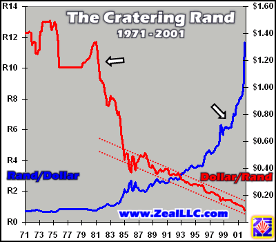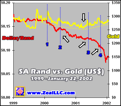 By now you are probably thinking, “Hamilton, you have been watching too many X-Files! Get a life.” Please hear me out though. Here is where the rand slide starts to get really interesting. I wrote the following paragraph for the January 2002 issue of Zeal Intelligence produced for our private clients. The newsletter was published on New Year’s Day, about four weeks ago…