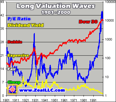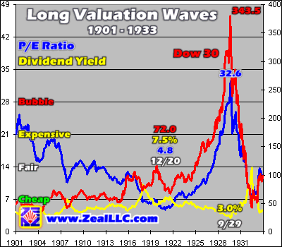 The first third of the 20th century climaxed in the most famous bubble and bust of all time. Not surprisingly, if you were armed with Long Valuation Wave wisdom and invested during this era, you could have easily bought near the bottom and sold close to the top.