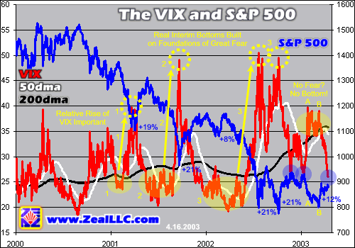 If you contrast this with the first major V-bounce of this Great Bear which happened in April 2001 (marked as VIX spike “1” above), it presents some problems. In April 2001 a VIX level of 40 marked a major bottom, but in January 2003 the exact same VIX 40 level didn’t witness anywhere near enough fear to mark a major bottom since a lower low followed within six weeks or so. So is VIX 40 low or high now, a time to throw long or a time to stay short?