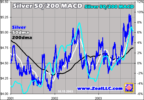 And last but not least we hadn’t yet internally developed any particularly useful trading tools for silver and silver stocks specifically. Recently however I had written about some gold trading tools we developed and are using in actual real-world speculations today, the Gold 50/200 MACD and the Relative HUI, and lots of good folks wrote in and wondered whether they would work for silver as well.