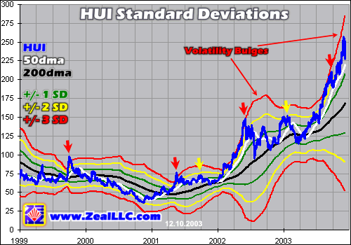 SD bands, and formal Bollinger Bands, are best used by speculators as relativity gauges considered in conjunction with other technical signals. When an index like the HUI pushes +3 SD above its mean, it does not provide a sell signal in isolation. Instead it just lets speculators know that the HUI is on the relatively-high edge and they should be cautious. SD bands reveal relatively overbought and relatively oversold levels that are most useful when used as a secondary confirmation of other primary trading signals.