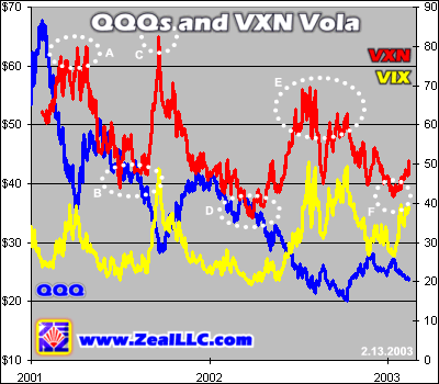 Since the VXN and QQV are barely even 2 years old, and all the experience that traders have with them today is in the current NASDAQ bust, I am very hesitant to place heavy reliance on them. The red VXN line shown above superimposed over the blue QQQ NASDAQ 100 tracking stock is the entire history of the VXN!
