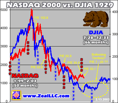 Our current Great Bear Bust will not end until stocks are undervalued. Period. Is the NASDAQ now undervalued? Our final graph, a small version of our famous “NASDAQ 2000 vs. DJIA 1929” graph, sadly lays out the evidence that the NASDAQ remains incredibly overvalued today with a lot farther left to plunge. Please don’t get mad at me! I don’t make the rules, I just strive to speculate correctly in whatever the markets may bring.