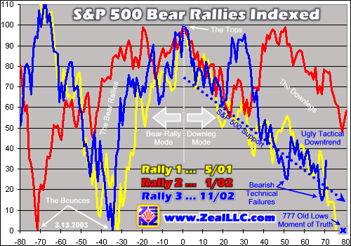 The bulls also amazingly claim that recent short-term technical action is bullish, something that utterly blows my mind. As this next graph shows, recent S&P 500 behavior is anything but bullish. This is an indexed graph, indexing the three latest major bear-market rallies circled in yellow on the graph above. It converts each rally into common terms so they are perfectly comparable.