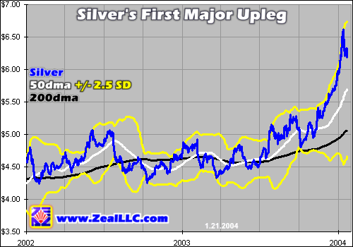 All of these silver-investor tears were washed away in the second half of 2003 though, in two distinct stages. In Q3 of last year, silver finally broke decisively above its long-time oppressive $5.00 overhead resistance. This exciting development rekindled some hope amongst silver’s legions of diehard fans, but was merely a small foretaste of the splendid feast to come.