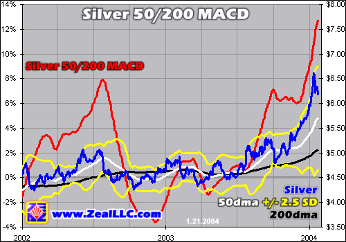 The actual numbers recorded around the halfway mark of 2003 were a bit under +1%, in the +0.5% range when silver bottomed. When this observation is combined with the fact that in bull markets raw prices, let alone 50dmas, rarely trade below their 200dmas, I believe that we ought to raise the lower end of the Silver 50/200 MACD indicator from -1% to +1% or so. Thus, going forward, I am going to be very interested in deploying long silver speculations (silver stocks, options, futures) when the Silver 50/200 MACD breaches +1% on the way down.