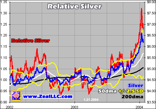 So in Relative Silver terms, I will be looking to redeploy aggressively long in silver-related speculations when Relative Silver trades under 1.03 after a major correction. On the back side of this trade, I will be raising my stops and recommending the same when Relative Silver trades above 1.20 after a major silver upleg. I will probably not sell outright at Relative Silver 1.20 since upside surprises are far more probable in bull markets than downside ones, but I will raise my stops and tread cautiously when silver extends this far above its key 200dma.