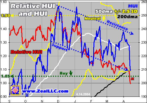 Back in early December, the HUI soared to 257 and stretched itself over 55% higher than its key 200dma support! In addition to being in an unsustainable parabolic spike, the vast technical gulf opened up between the HUI and its 200dma was a clear warning signal to contrarians to be on alert. We went neutral and raised our own trailing stops on gold stocks in late November when the rHUI broke above our 1.50 neutral line. In hindsight I am very thankful to see that this was the right decision to make.