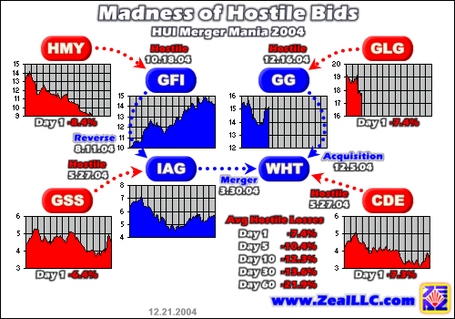 With at least 4 of the 7 major HUI component acquisition attempts in 2004 outright hostile, without the consent of the target, I would like to discuss their ugly impact on investors this year. This is not purely academic for me either, as I, my partners, and our clients were blasted out of positions in acquirers when our stops were nearly immediately hit in 3 of these 4 hostile HUI deals.