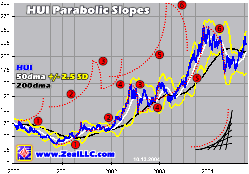 In order to analyze this thesis, we are going to take a look at parabolas in the HUI this week. The HUI is the premier unhedged gold-and-silver stock index, and probably the best performing sector on the planet over the last several years. The HUI is up a massive 614% bull to date from its November 2000 lows to its latest interim top in December 2003. Our subscribers, my partners, and I have been blessed with enormous realized profits trading this largely overlooked bull market.