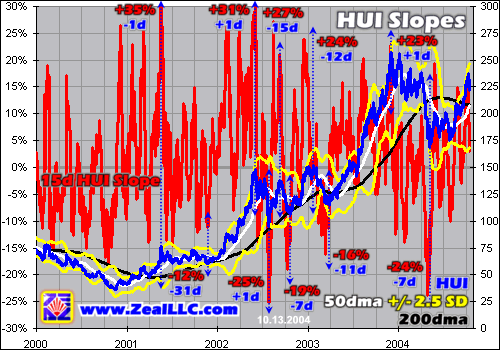 Our final graph attempts to quantify this initial attempt to measure parabolic slopes. The HUI slides over to the right axis, and the 15-day percentage change in the HUI is graphed on the left axis in red. While the raw red squiggly line looks like the electrocardiogram of Alan Greenspan the day gold crosses $1000, it actually hides some provocative data. While this can’t be the ideal slope measurement, it still illustrates the general validity of this parabola trading principle.