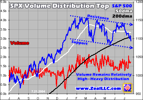 On the contrary, this higher volume coincides with decaying prices suggesting that, on balance, there are more offers to sell stock than to buy it. Whenever sell orders outweigh buy orders, the prevailing prices must fall until a new market-clearing equilibrium is established at a lower price. In 2004 as hours turned into days then weeks then months, the S&P 500 prices have continued to fall so the high volume is apparently decidedly bearish with sells outnumbering buys on balance.