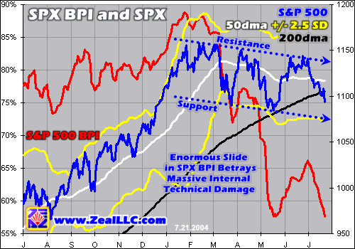 For each of the 500 companies represented in this ultimate proxy for the US stock markets, it takes targeted individual selling in them alone to cause their individual point-and-figure price charts to no longer show buy signals. With the absolute 31.2% drop in the SPX BPI since January, this means that 156 S&P 500 component companies have already experienced individualized heavy selling so far in 2004. The internal damage being done by this decaying S&P 500 top has been enormous, even while the headline index remains deceptively placid.
