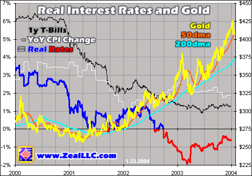 Today, as a gold investor and speculator, I like to update and reexamine our real-interest-rate and gold charts about once every quarter or two, to keep an eye on the progression of both the gold bull and the Greenspan War Against Savers. As we haven’t looked at real rates and gold since September, this week seemed like a great opportunity to update this absolutely crucial analysis for savers, anyone who has worked hard enough during their lives to accumulate surplus capital.