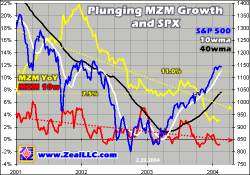 The massive decoupling between the rate of monetary growth and the short-term trend in the US stock markets at the end of 2003 is even more apparent in MZM terms. The final upsurge in the blue S&P 500 and the final plunge in the yellow MZM year-over-year growth rate look like mirror-image opposites on the right side of this chart. I would be really surprised if such an enormous divergence of monetary growth rates and stock gains can persist for much longer.