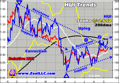 At the moment the HUI is in a fascinating place technically, tightly meandering at the convergence of several major zones. First, the HUI is challenging its latest tactical resistance line, the ascending blue line on the right. Second, it is also challenging its old downtrend resistance line that arose from its correction in early 2004. Finally and most importantly, it is also challenging its key 200dma, which has been its major support for most of its bull to date.