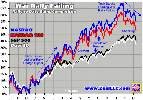 The war rally, however, was not led by the value players looking for historically sound returns. The very same slack-jawed starry-eyed New-Era maniacs who fed the NASDAQ bubble of the late 1990s led the war-rally charge northward as well! The war rally was fueled by tech speculators buying the most-overvalued tech stocks with the most meager earnings and effectively zero dividends. Blue-chip investing lagged far behind the war-rally tech mania.