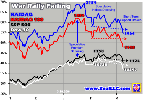 These ominous technical breakdowns highlight the serious trouble the war rally is in. Without its tech leaders, odds are that it cannot continue powering higher. With the psychologically immense NASDAQ 2000 level failing as support and the rapidly shrinking speculative premium of the war rally betraying increasing technology selling, this weakness is almost certain to feed on itself.
