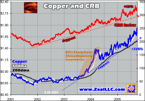 Our dual-axis chart shows the secular trend that general commodities, represented through the CRB Commodities Index, have had since 2001. In addition to the CRB, the price of copper is charted over this same time period represented in dollars-per-pound as it trades on the COMEX. It is readily apparent that the two trends are marching in unison to the tune of a secular bull market with the CRB rising over 80% since late 2001 and copper shooting up over 200% in this same time period.