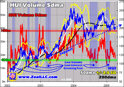 Low volume also coincides with the HUI correcting back down to its linear support line. In any secular bull market, one of the highest-probability-for-success times to buy is when a price retreats back to support in a normal, healthy bull market correction. So far in 2005 the HUI has kissed support twice now, each time accompanied by the telltale low volume. Once again today the HUI composite volume threatens to fall under $16m shares on a 5dma basis.