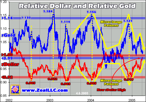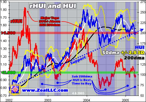 Thus everything we have witnessed so far in 2005 is merely par for the course. There is nothing special, scary, or anomalous about the latest HUI weakness compared to its bull-to-date behavior. With the root cause of the HUI correction understood, our final chart gets back into trading the gold-stocks directly. It is also a Relativity chart, with the rHUI line showing where the HUI has traded as a multiple of its key 200dma support over time.