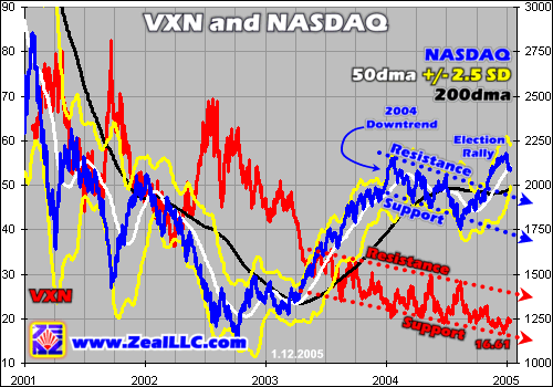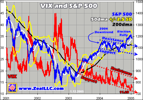 This week I would like to update this volatility-index no-fear analysis, discussing the events of 2004 that led to today and what this may portend for 2005 in the major US equity markets. Anomalously extreme sentiment readings can only be ignored with great peril, and investors ought to take such rare developments very seriously.