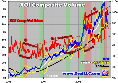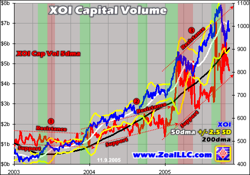 In 2004 XOI capital volume started to grow and created a new uptrend. By the end of the year over $2b worth of XOI-component shares were traded a day. While the index had climbed nicely, general interest in it still remained relatively anemic. All of this changed dramatically as 2005 dawned though, with XOI cap volume suddenly blasting north of $5b while trailing the first major upleg of this year.